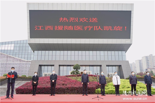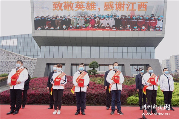 省人大常委會副主任劉曉鳴出席活動並為江西援隨醫療隊頒發“抗擊新冠肺炎疫情先進集體”榮譽牌匾。江西省援隨前方指揮部指揮長、江西省委統戰部常務副部長陳敏,市委書記陳瑞峰分別講話。市委副書記、市長克克主持儀式。市人大常委會主任夏衛東,市政協主席馮茂東,市委常委、常務副市長林常倫,副市長鄭曉峰等參加活動。與會省市領導為江西醫療隊代表頒發“抗擊新冠肺炎疫情先進個人”榮譽證書。